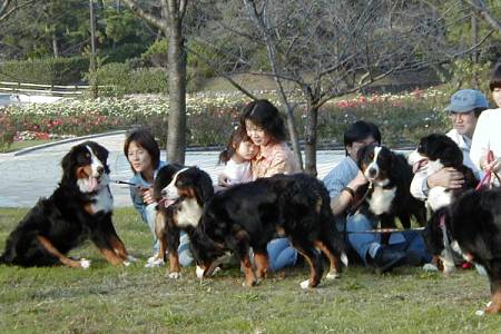 ラッキーくん、バーニーちゃん、地面を嗅いでいるのはプリンちゃん、